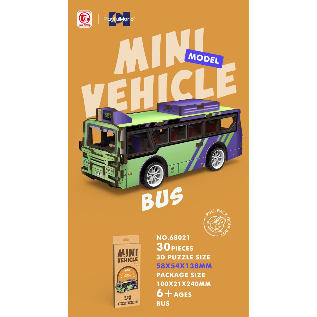 3D puzzle dřevěné - Autobus. Rozměry 14x5,4x5,8 cm. 30 dílků. Na zpětné natažení.