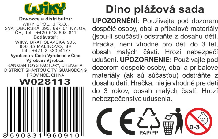 Dino plážová sada. Obsah balení - hrábě, lopatka, 3xformička, vodní mlýnek (výška 26 cm).