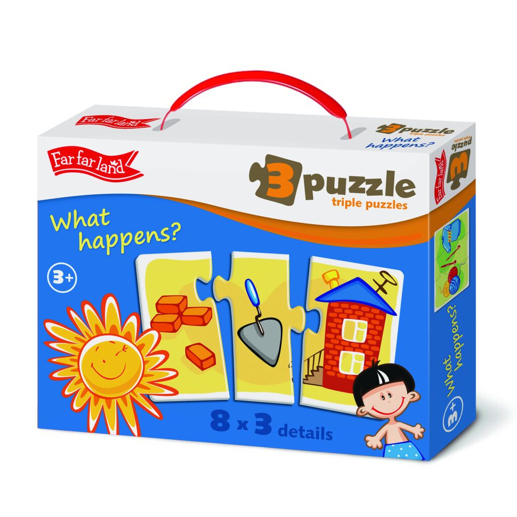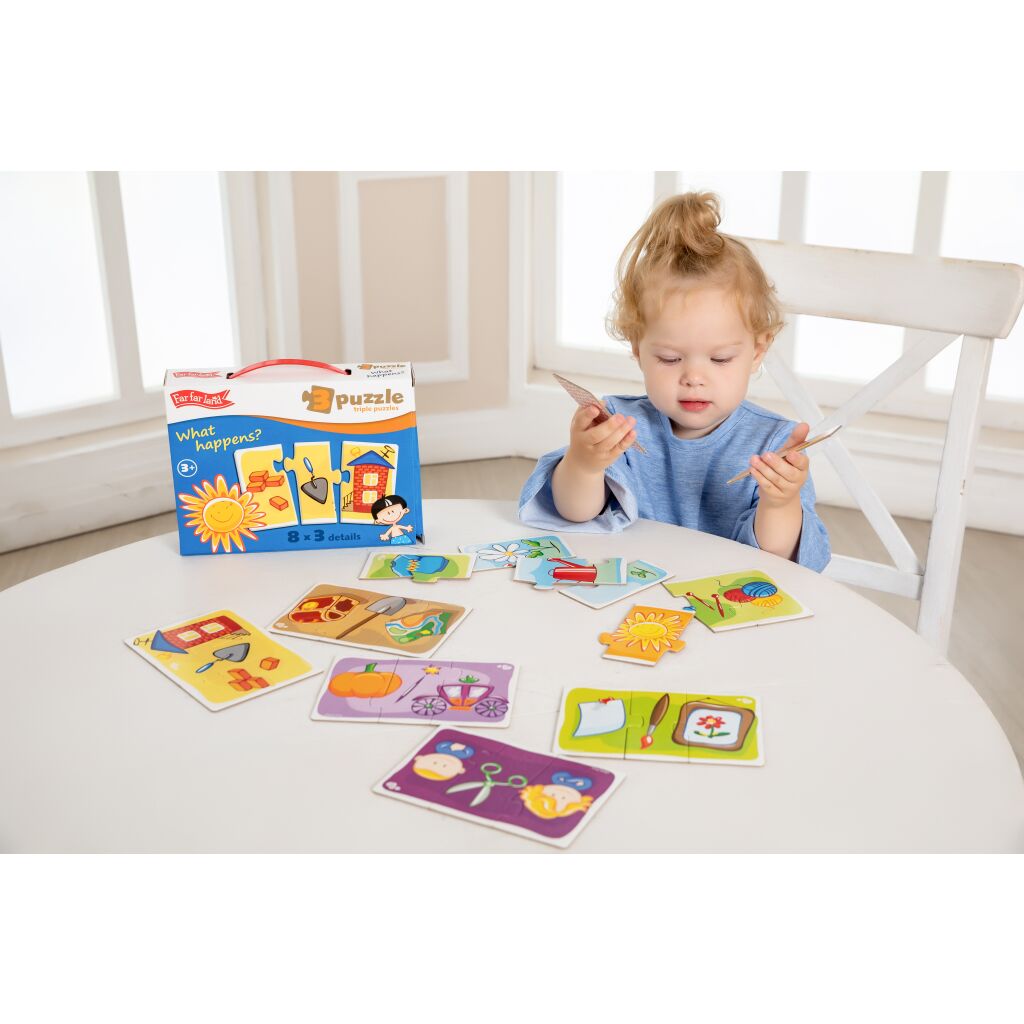 Far Far Land Puzzle činnosti trojice 8 obrázků Balení obsahuje 8 puzzle obrázků, které se skládají ze 3 dílků (vyobrazují trojice k sobě patřících předmětů). Tato hračka rozvíjí logiku, motoriku, kreativitu a koordinaci ruky a oka Doporučený věk. od 3 let