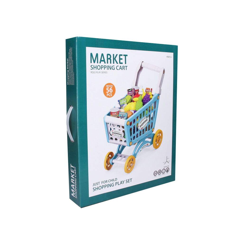 Nákupní vozík s potravinami. Rozměry vozíku 40 x 24,5 x 44 cm. Obrázkový návod na složení se nachází na obalu. Balení obsahuje 56 kusů potravin.