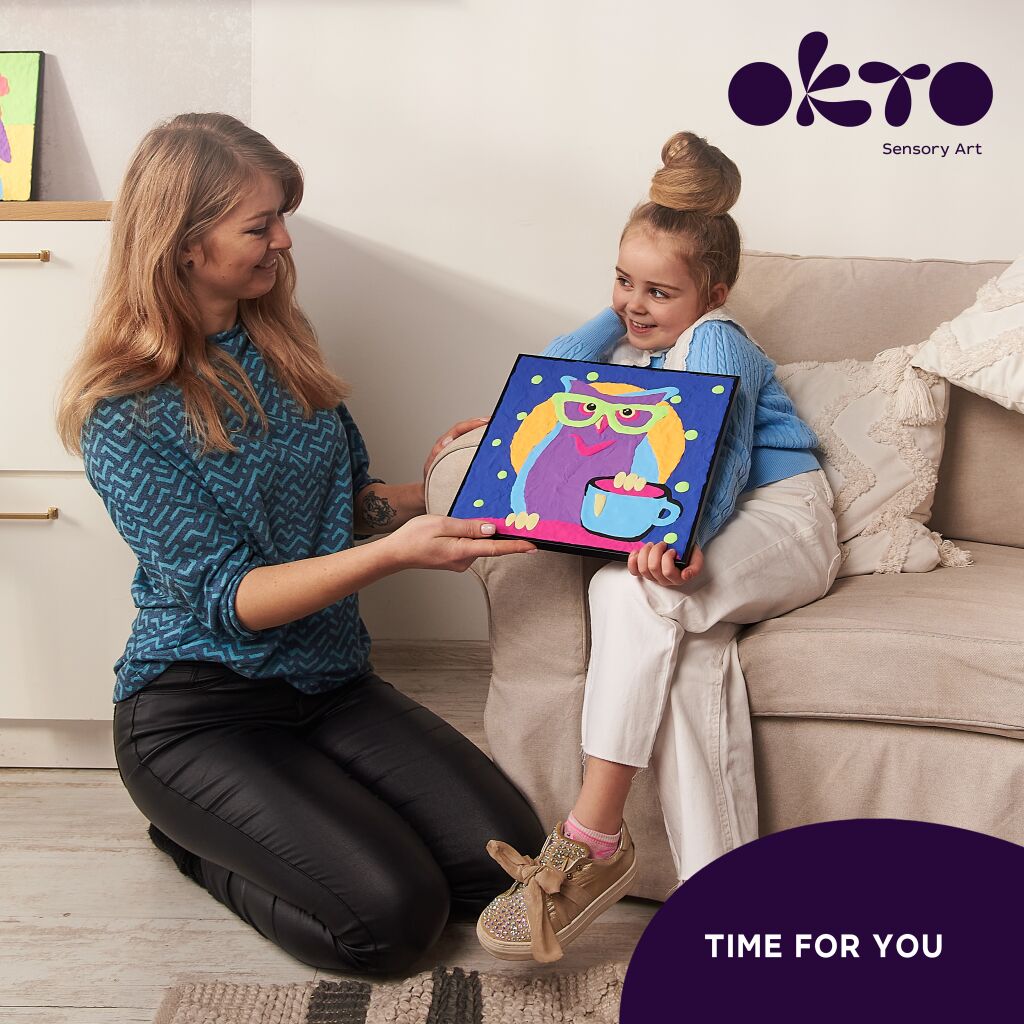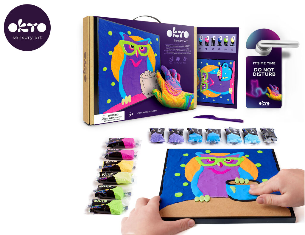 OKTO Sova výtvarná sada. Samotvrdnoucí hmota (air clay), malování prsty. Velikost plátna 29x29 cm. Obsah balení - plátno, obrázkový návod, tvarovací nástroje, samotvrdnoucí hmota.