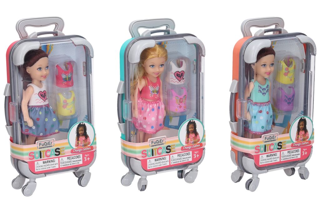 Panenka v kufru. Velikost panenky 14cm, velikost kufru 20cm. Obsahuje panenku a dvě náhradní trička na panenku.