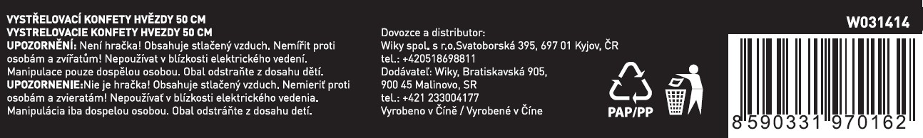 Párty konfety vystřelovací Hvězdy 50 cm. Balení: 12 ks v display boxu. Dodržujte prosím všech instrukcí na etiketě. Nenechávejte děti bez dozoru, nemiřte do obličej, na tělo ani zvířata. Rozměry: 48 x 5 cm 23g stříbrných a zlatých hvězdiček