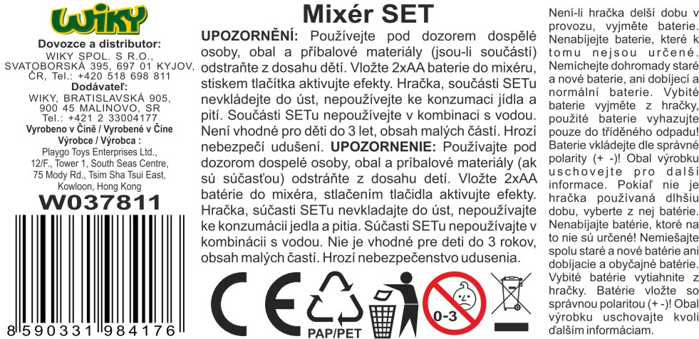 Velikost 21cm. Mixér lze také použít jako přenosný kelímek. Obsahuje mixér s víčkem, brčko, víčko na kelímek, potraviny a lžičku. Mixér při držení tlačítka mixuje a tlačítko svítí. Po puštění tlačítka se mixér vypne. Baterie součástí.