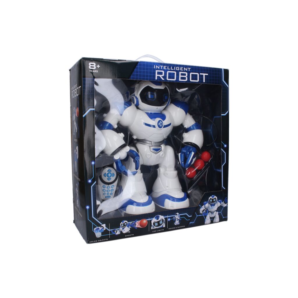 Robot střílející míčky RC na dálkové ovládání. Rozměry 36x17x40 cm. Infračervený port. Světelné a zvukové efekty. Funkce - střílí míčky z levé ruky, drží předměty v pravé ruce, podsvětlený obličej, programování, chůze, tanec, hudba, demo režim, nastavení hlasitosti. Součástí 3 míčky. 5xAA baterie do robota, 2xAA do ovladače nejsou součástí.