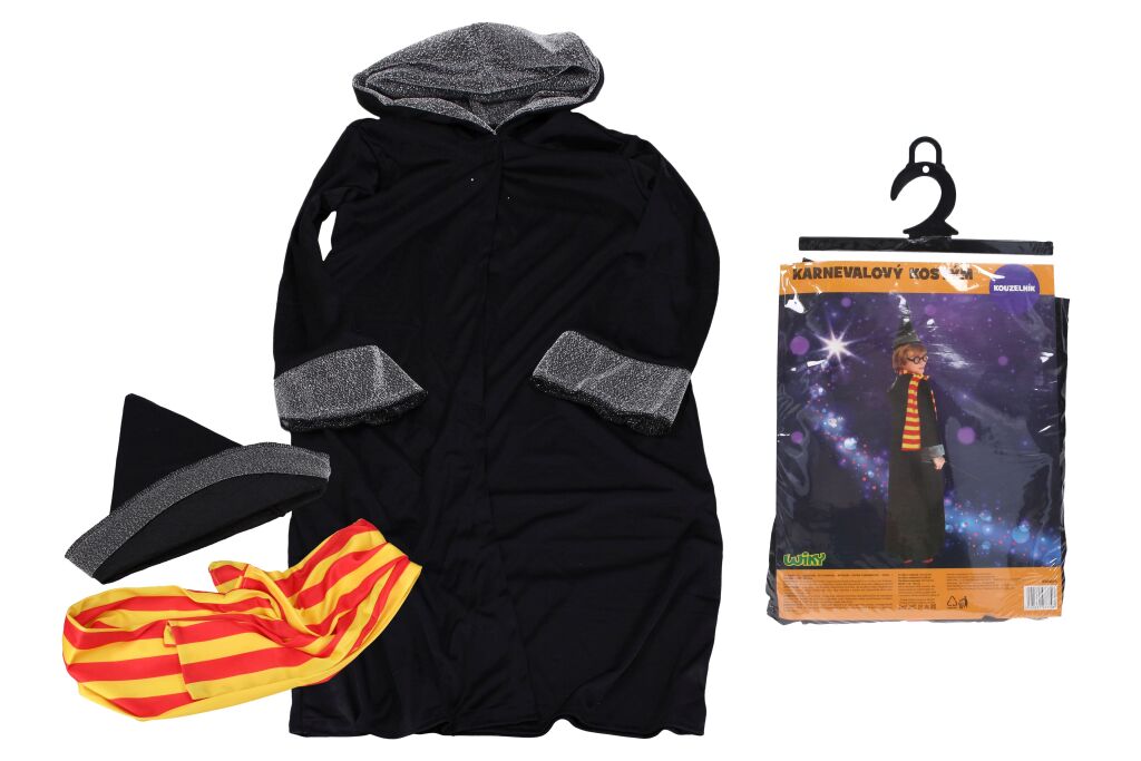 Set karneval kouzelník. Pro děti o velikosti 115-125 cm. Součásti kostýmu: hábit, klobouk, šála.