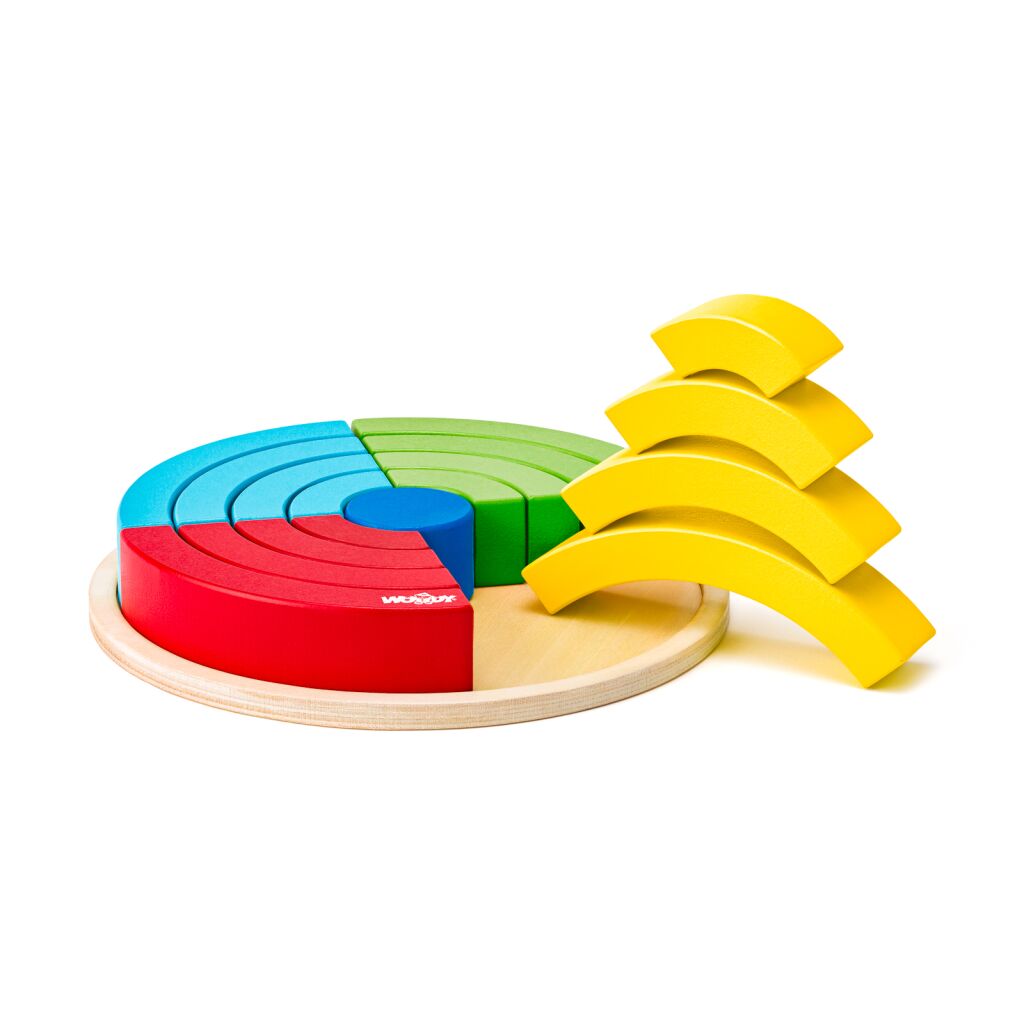Dřevěná skládačka pro nejmenší. Dítě skládá z duhových částí oblouků kola, která pak skládá od středu od nejmenších po největší. Pokud vše správně poskládá, bude výsledkem kruh skládající se ze čtvrtin 4 různých barev. Součástí výrobku je dřevěná podložka jako základna. Podporuje rozvoj jemné motoriky, logiky a kombinatoriky. Rozměr: 17,5 x 17,5 x 2 cm