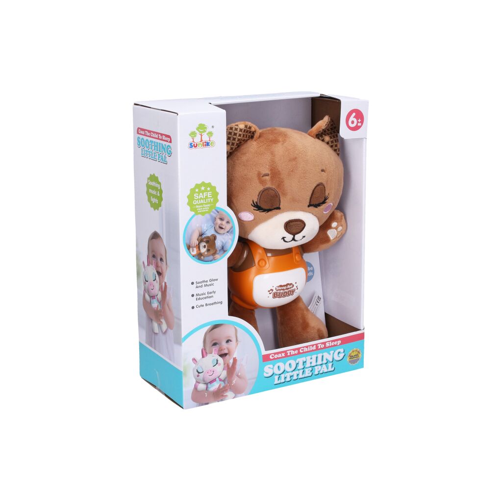 Usínáček medvěd. Velikost 29cm. baterie 3xAAA nejsou součástí. Přepínač on/off na boku zvířátka. Stisknutím bříška se spouští zvukové efekty- 1. stisknutí ukolébavka, 2. stisknutí uklidňující hudba, 3. stisknutí chrápání, 4. stisknutí pouze světlo, 5. stitknutí vypnutí.